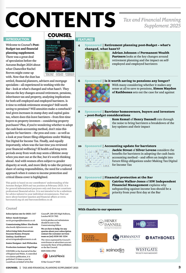 This guide is based on our contributors’ understanding of the Autumn Budget 2024 and tax position at February 2025. It is for general informational purposes only and does not constitute professional advice. It is not intended to be a substitute for advice tailored to your individual circumstances. You can find out more about barrister taxation and financial affairs at barcouncil.org.uk and barcouncilethics.co.uk.