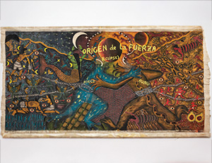 Organised into themes, the exhibition allows us to trace the evolution of Yahuarcani’s work while understanding the consistent threads that run through it. From his early tourist paintings to his mature explorations of Uitoto mythology, to his paintings which show the impact of COVID-19 on his community, we witness an artist discovering that his great power lies in mining his own cultural inheritance and finding that the themes unearthed have global resonance.