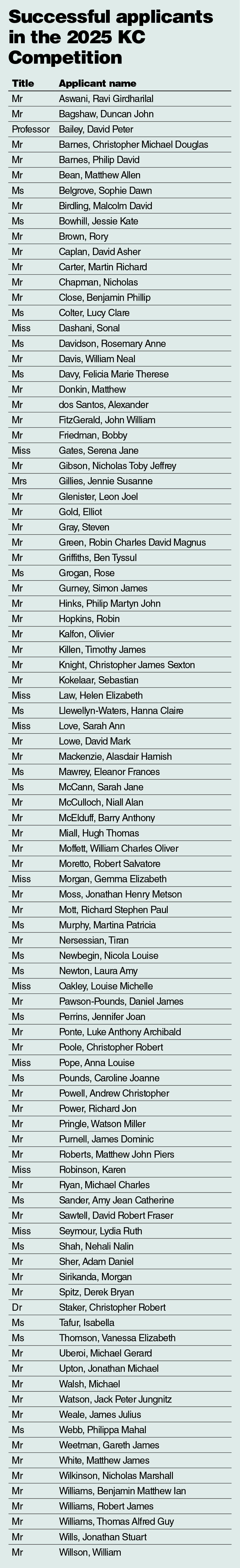 Each cohort produces different figures but some factors are constant, year on year. Having gone through the chambers’ website entry of each of the 96 who are recommended for appointment, it is obvious that applying for King’s Counsel is something which is only relevant to a small part of the Bar. There are some 400 sets of chambers with more than one practising barrister in them. No more than a quarter of sets ever produce silks. The average number of chambers per year is 65, as it was in 2025. Four sets produced the six family silks; all are London based. Twenty-one sets produced the 24 criminal silks; 13 are London based. Thirty-nine sets produced the 66 civil silks; 37 are London based. Five London-based chambers produced 17 silks between them; 19 further sets produced two each. The non-London sets were in Bristol, Manchester, Leeds, Birmingham, Chester and Exeter. Every new silk is in chambers that already has silks, a fact which repeats itself every year with no more than the occasional exception of one or two first timers for their chambers. On average, the criminal sets had 13 silks each, the family sets 12 and the civil sets 27.