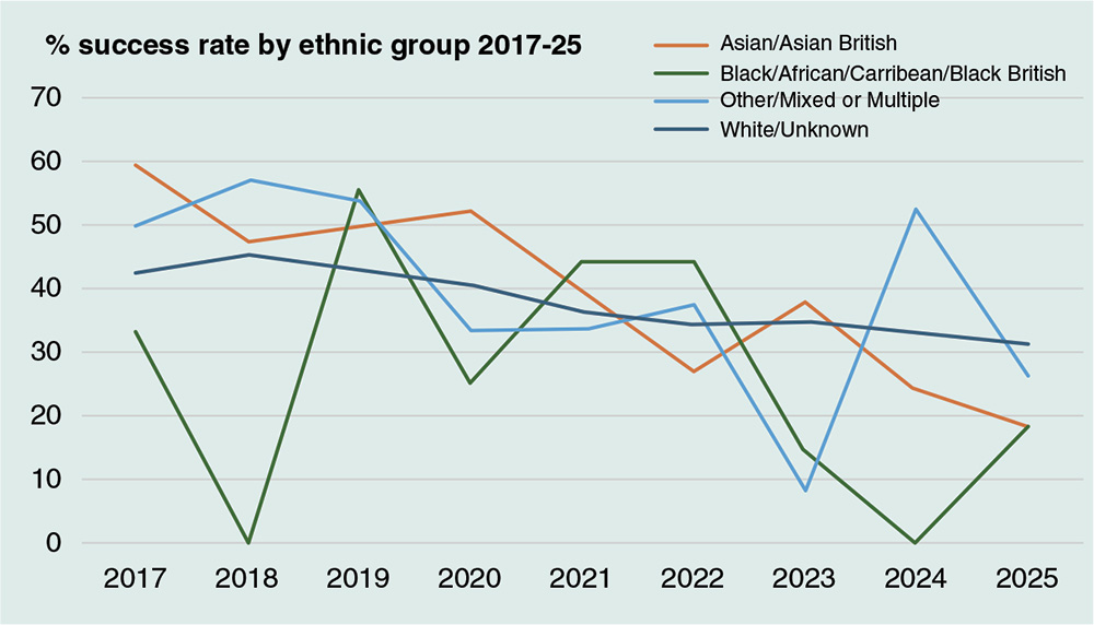 The average number of Black, African, Caribbean or Black British applicants is 7.3 per year, with two annual appointments or 27.4%. No Black silks were successful in the 2024 competition but this year two male barristers from a Black ethnic group were appointed, one in civil work and one in family work (18.2%).